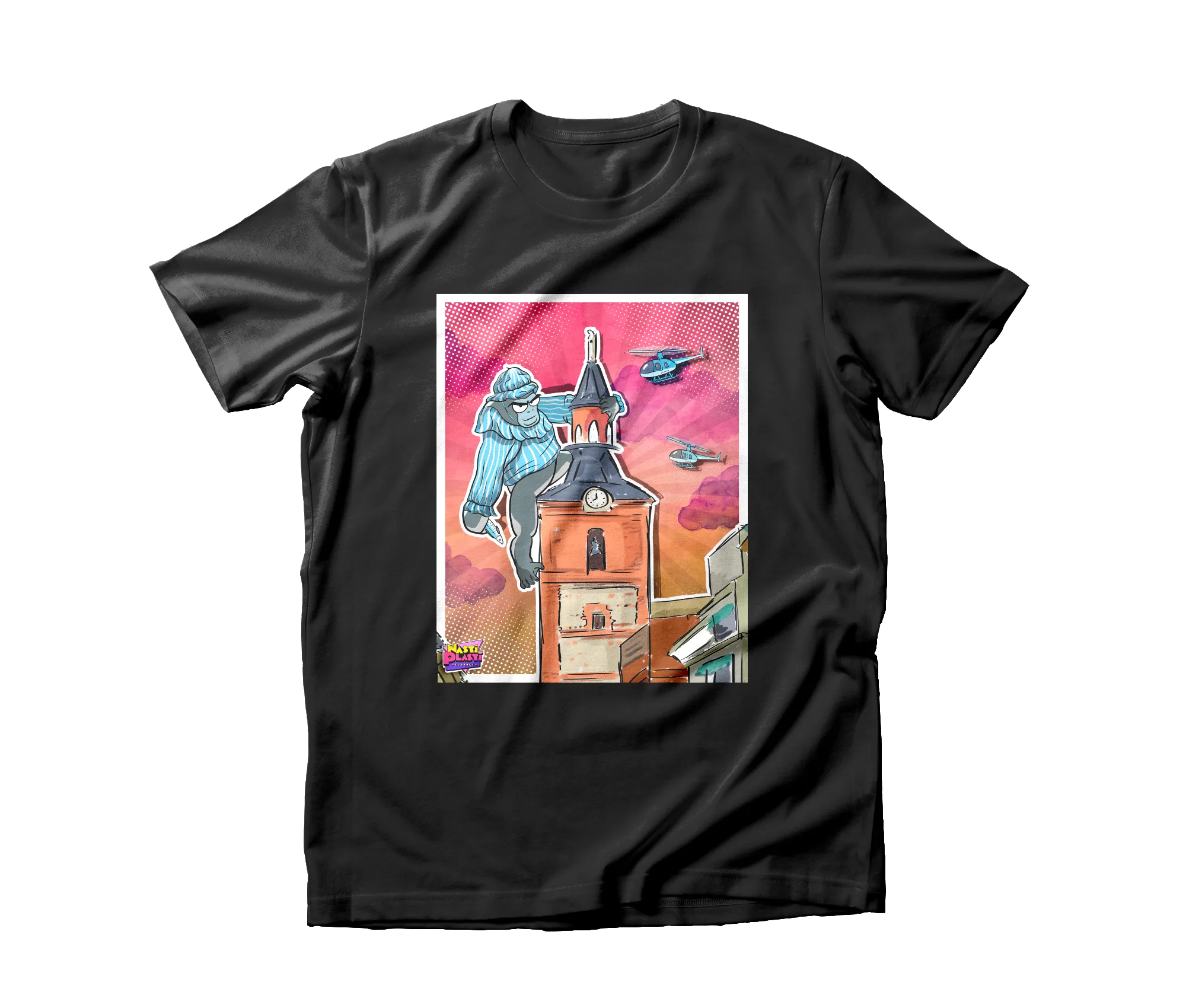 Con esta camiseta empezó todo. Quisimos presentarnos con un homenaje al personaje más popular de Herencia. Perlé, para quién no lo conozca, simboliza a la autoridad, de forma paródica, durante los días de carnaval. Teníamos la idea de coger a King Kong amarrado al Empire State de Nueva York como imagen icónica de la historia del cine y subirlo a la torre de la iglesia en pijama. El diseño nos gustó tanto que decidimos estamparlo en camisetas y crear Nasti de Plasti como algo muy local. Con el tiempo nos volvimos a enamorar de nuestra cultura, esa a la que, a veces, no le hacemos caso por tenerla demasiado cerca, y decidimos darle imagen, sentido y mensaje. De dentro pa fuera. De la Mancha pal mundo.